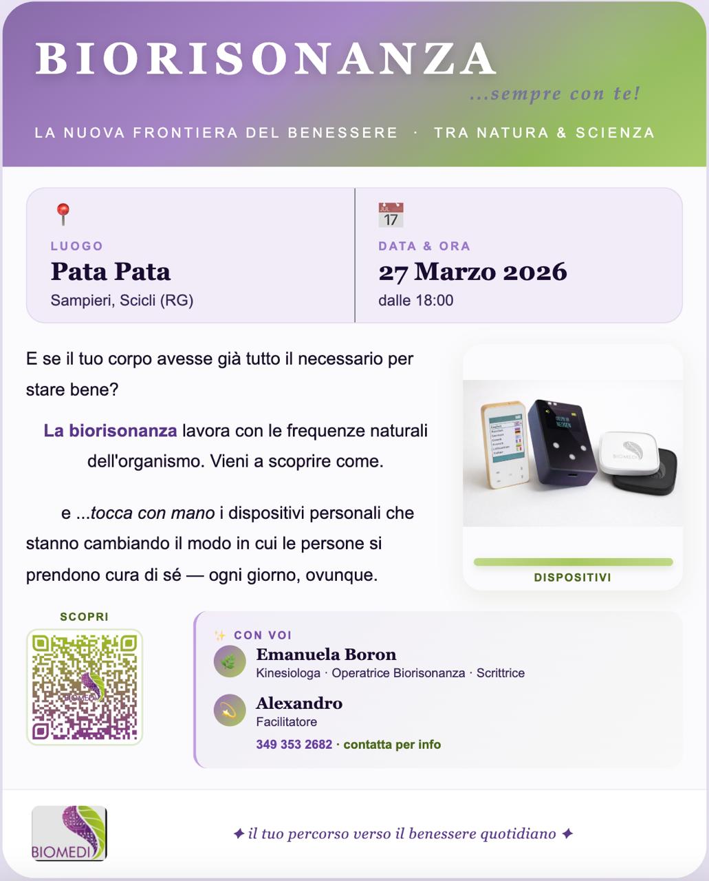 - 🔬 Dimostrazione pratica — tecnologie personali e portatili per integrare la biorisonanza nella quotidianità. Le vedremo insieme, le toccheremo con mano.