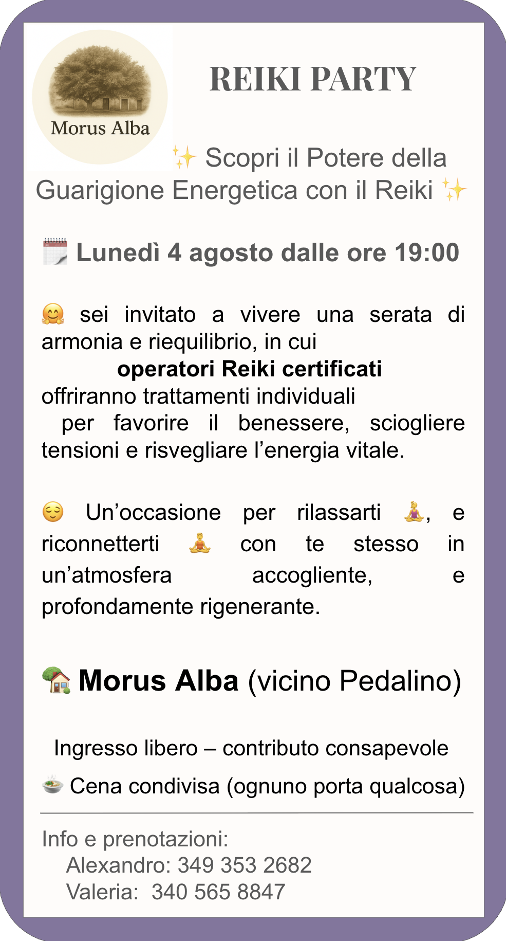 📅 Il 4 agosto accogliamo il Reiki Party, una nuova tappa del nostro percorso.